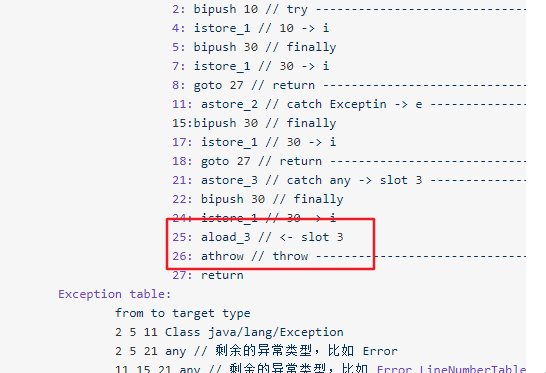 至于第8行的 astore_2 含义就是将异常对象存入Exception table表的e槽位中,相当于就执行到了catch块中,其余解读同理上述。