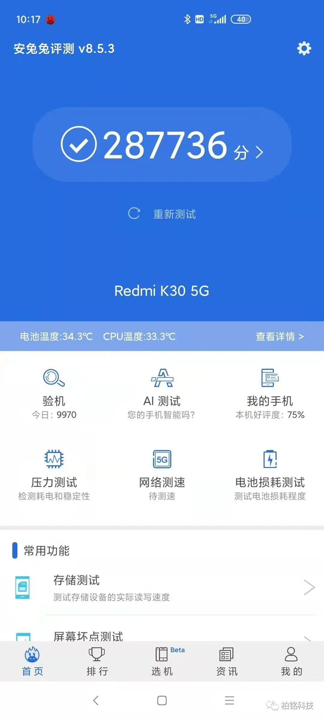 随后笔者又以自己的红米K30测试了安兔兔,测试完毕后显示的电池温度为34°,CPU温度为33度。