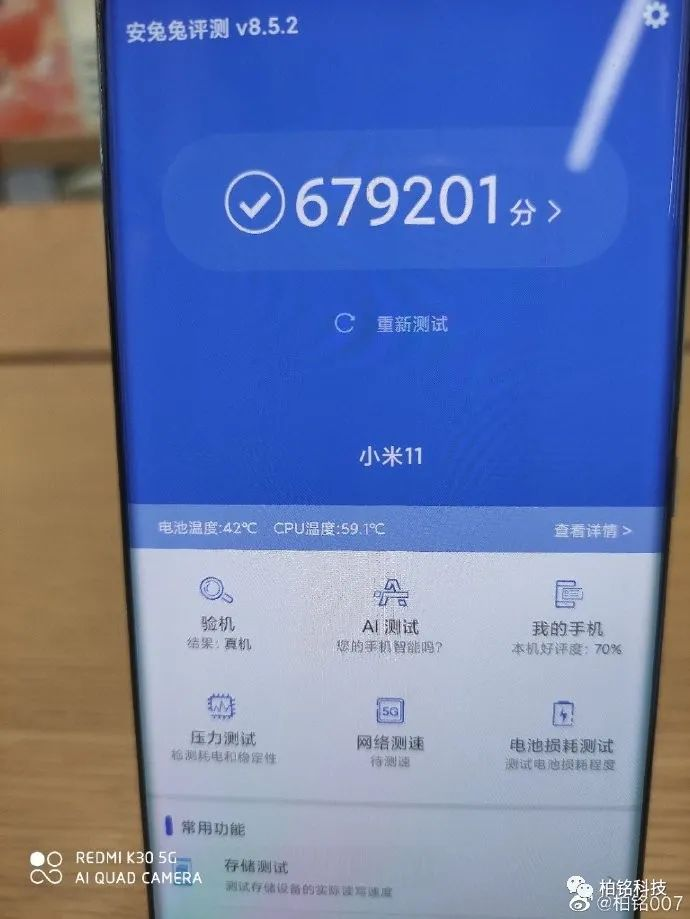 昨天逛街,进了广州白云区凯德广场的小米之家,在现场用小米11运行了安兔兔,测试结束后安兔兔的数据显示小米11的电池温度达到42°,CPU温度达到59°。
