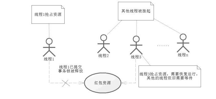 只能有一个事务占据资源,其他事务被挂起等待持有资源的事务提交并释放资源。当图中的线程 1 提交了事务,那么红包资源就会被释放出来,此时就进入了线程 2,线程 3……线程 n,开始抢夺资源的步骤了,这里假设线程 3 抢到资源