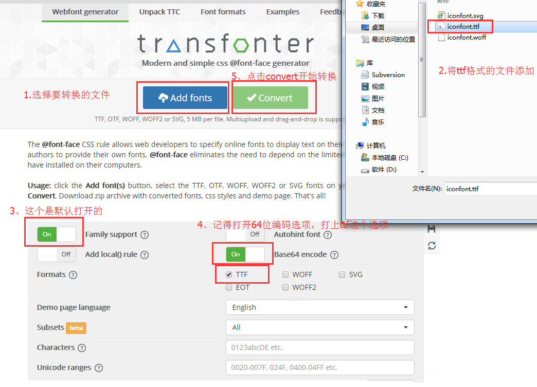 进入https://transfonter.org/平台,将解压出来的ttf字体文件转化成base64格式。流程如下: