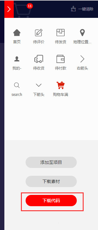 搜索“购物车”图标--->点击“添加入库”-->点击购物车进入购物车-->点击下载代码按钮。