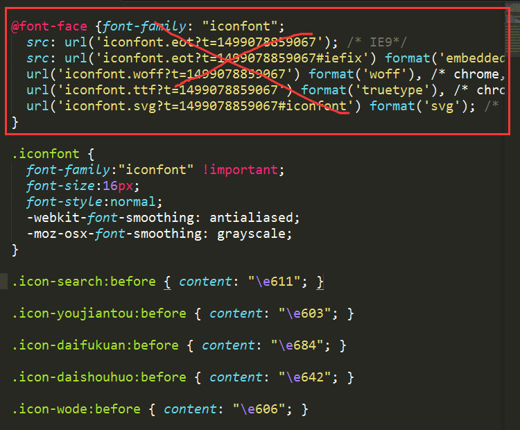 2--打开没有转换过的download.zip解压出来的文件,找到iconfont.css文件,将这个文件中的没有打岔的内容复制到index.css文件中。@font-face这部分不要,只要下边的这部分。