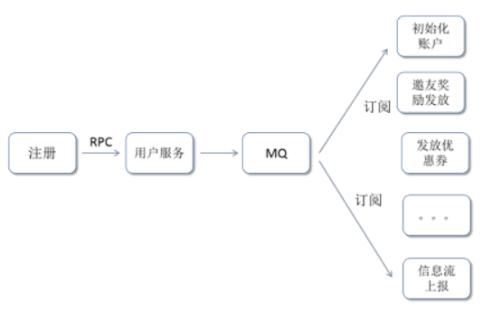 用户完成注册动作后,只需要往 MQ 发送一个用户注册的通知消息,下游业务如需要依赖注册相关的数据,订阅注册消息的 topic 即可,从而实现了业务的解耦。