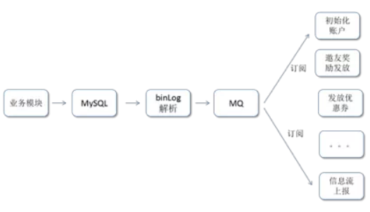 为此,在解耦的过程中通过订阅数据库的 BinLog 日志,开发了一套 BinLog 日志解析模块,专门解析日志,然后生成 JSON 字符串后发送消息到 MQ,下游订阅 MQ 即可。流程如下: