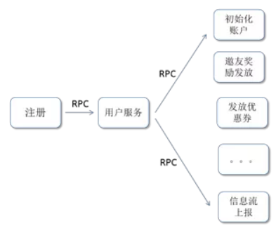 对于通过信息流获客的企业而言,当用户注册时,因业务需求会调用用户服务,然后执行一系列操作,注册 -> 初始化账户信息 -> 邀友奖励发放 -> 发放优惠券 -> ... -> 信息流数据上报。