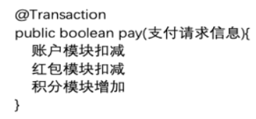 用户在平台上支付他订购某种业务的时候,需要涉及到支付服务、账户服务、优惠券服务、积分服务,在单体模式下这种业务非常容易实现,通过事务即可完成,伪代码如下: