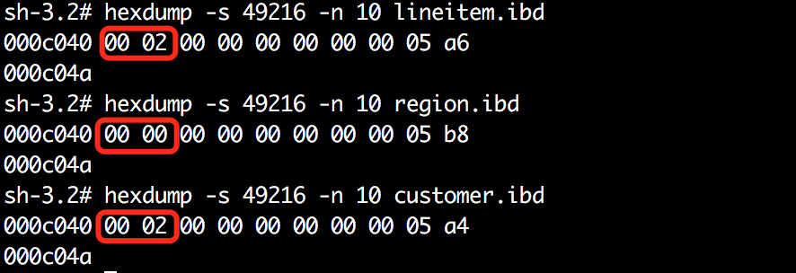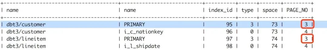 可以看出数据库dbt3下的customer表、lineitem表主键索引根页的page number均为3,而其他的二级索引page number为4。关于二级索引与主键索引的区别请参考MySQL相关书籍,本文不在此介绍。
