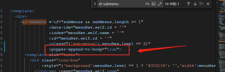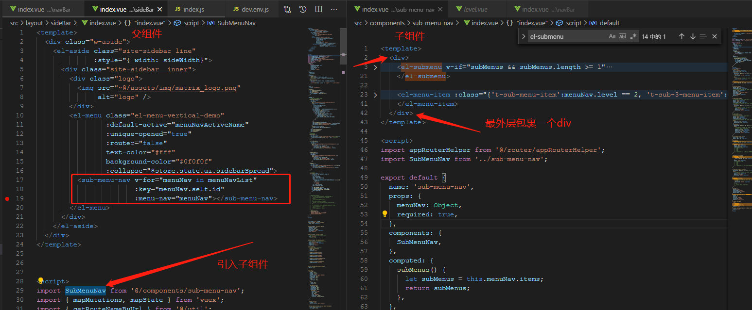 页面上结构:把<el-submenu>封装成了子组件,左边是父组件,右边是子组件。