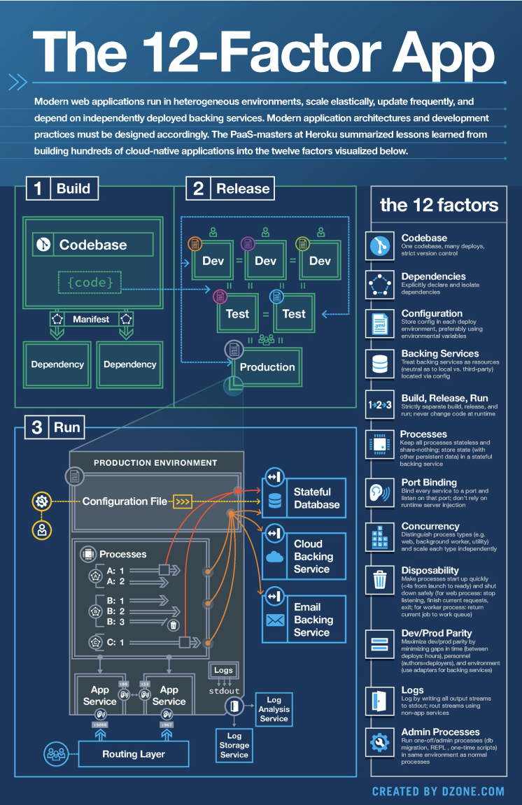 2012 年,Heroku 创始人 Adam Wiggins 发布十二要素应用宣言。它为构建一个优雅的互联网应用,定义了需要遵循的一些基本原则和方法论,也广泛影响了众多的微服务应用架构。十二要素重点关注:应用程序的健康成长,开发者之间的有效的协作,以及避免软件架构腐化的影响。其内容在今天也值得每个同学认真体会。