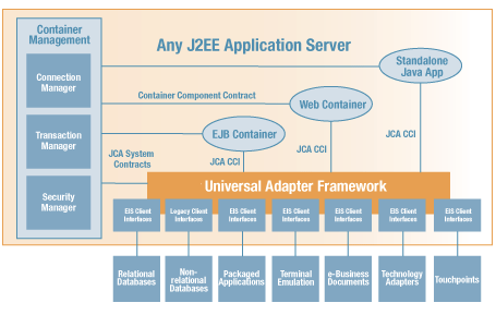 不同的外部中间件通过 Java Connector Architecture 规范实现与应用服务器的插拔。应用通过 JNDI 在运行时实现与具体资源的动态绑定。Java EE 将系统的 cross-cutting concern下沉到应用服务器来解决,让开发者只关注应用的业务逻辑,开发效率有了较好的提升;同时减轻应用对环境和中间件实现的依赖,比如可以在开发环境中用 ActiveMQ ,在生产环境中使用 IBM MQ 替换,而无需修改应用逻辑。