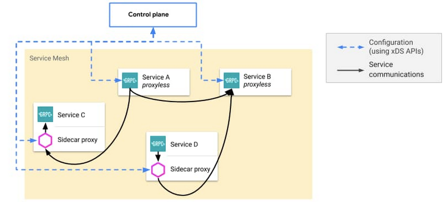 ”proxyless “服务网格概念浮出水面,一个概念示意图如下: