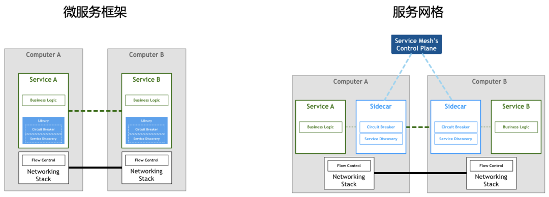 在微服务时代,以 Spring Cloud 与 Apache Dubbo 为代表的应用框架取得了巨大的成功,它们通过代码库方式提供了服务通信、服务发现和服务治理能力(流量转移、熔断、限流、全链路追踪等)。这些代码库被构建在应用程序本身中,随着应用一起发布和维护。这样的架构存在一些无法回避的挑战。