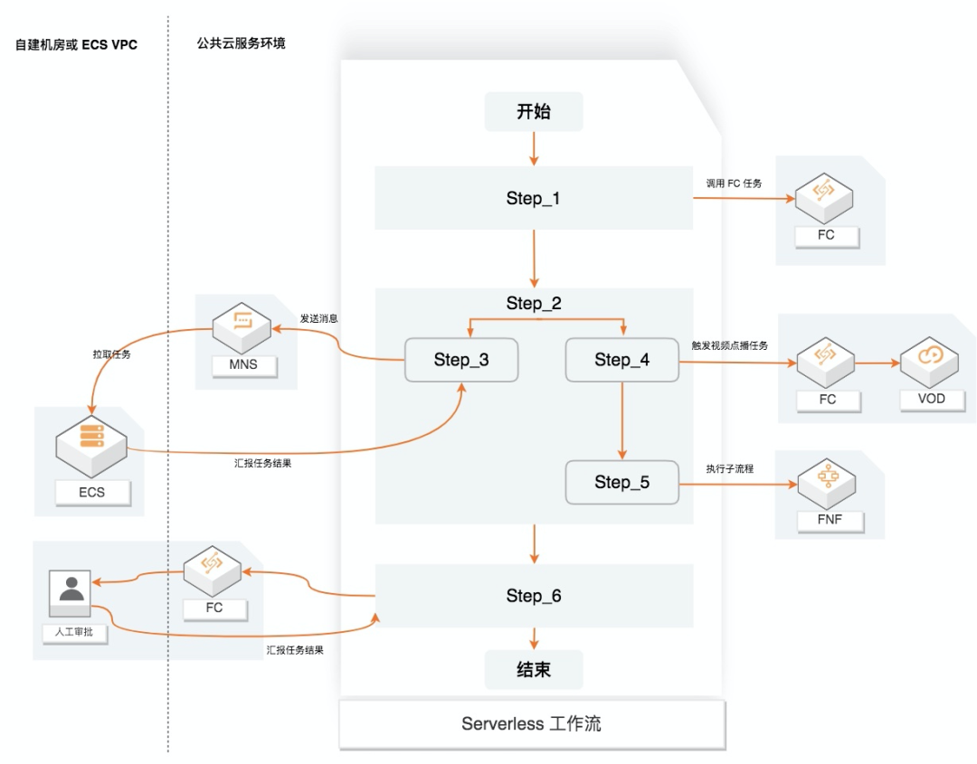 Workflow Orchestration 工作流编排:以阿里云 Serverless 工作流为例,可以通过一个声明式的业务流程来编排任务。这种方式简化了开发和运行业务流程所需要的任务协调、状态管理以及错误处理等繁琐工作,让开发者聚焦于业务逻辑开发。