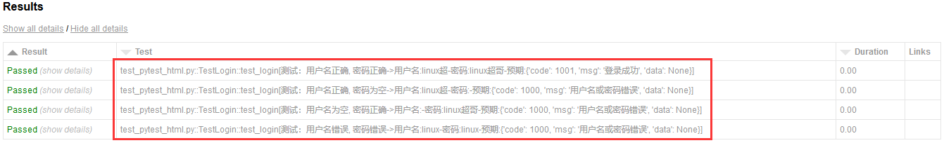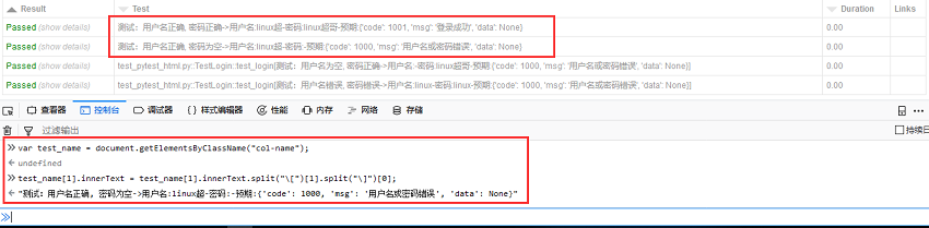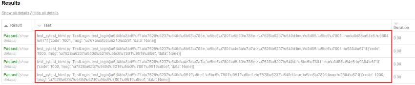 第3行,5行,就是报告中Test信息的来源了,test_pytest_html.py::TestLogin::test_login[data0] 这样一条信息,实际是用例的nodeid,而【data0】是测试用例参数化时的每个参数,我之前写过一篇关于参数化方法@pytest.mark.parametrize("data", test_data)的参数ids作用的文章,ids的作用主要就是用来标记测试用例(不知道的可以去看一下那篇文章),增加测试用例执行后输出信息的可读性,因此我们可以使用这个参数来改变【data0】,让它显示我们的测试数据,ok,在我们的测试代码中添加并修改如下代码