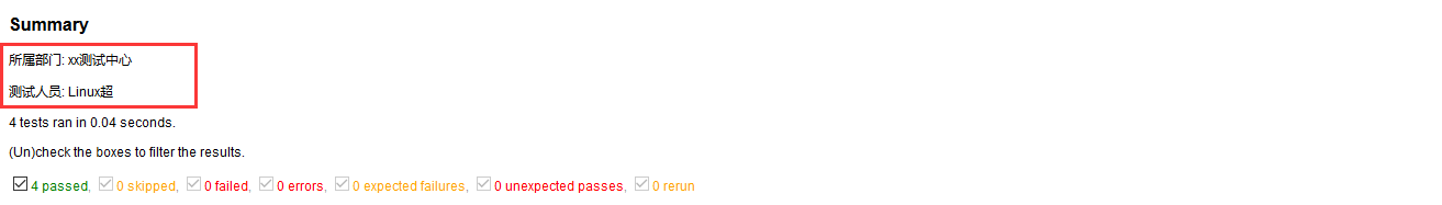 原始的Summary部分只显示了测试用例数及用例执行时间,那么如果我们想在这个位置添加测试人员等一些信息该如何实现?同样在conftest.py文件中添加如下代码