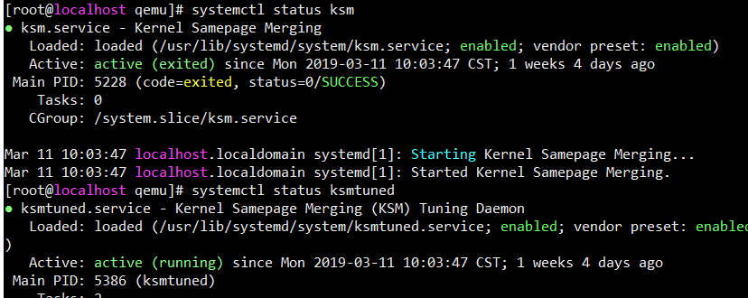 承载KSM服务的有两个,ksm服务和ksmtuned服务,需要两个服务同时开启,才能够保证KSM的正常使用