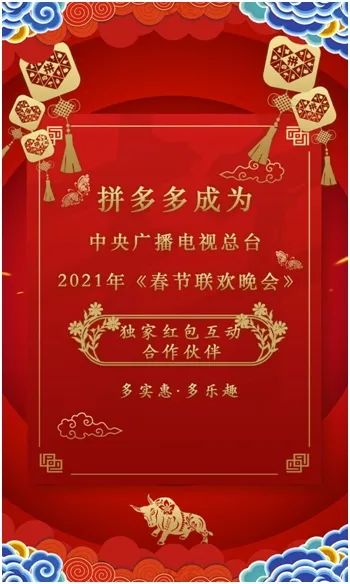 去年9月24日,拼多多豪掷千金终于如愿成为中央广播电视总台2021年《春节联欢晚会》独家红包互动合作伙伴。