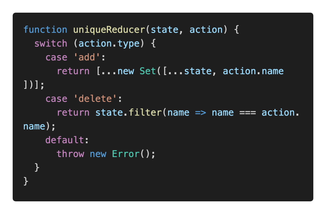 单击添加按钮后,处理程序将调用dispatch({type:'add',name:newName})。调度添加操作使减速器uniqueReducer向状态添加新产品名称。