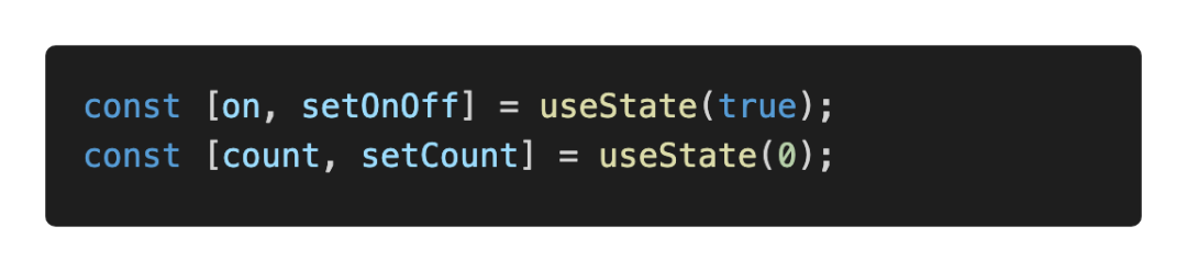 第一个属性state.on包含一个布尔值,表示开关。state.count保存一个表示计数器的数字,例如,用户单击按钮的次数。