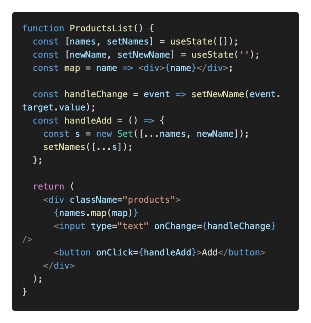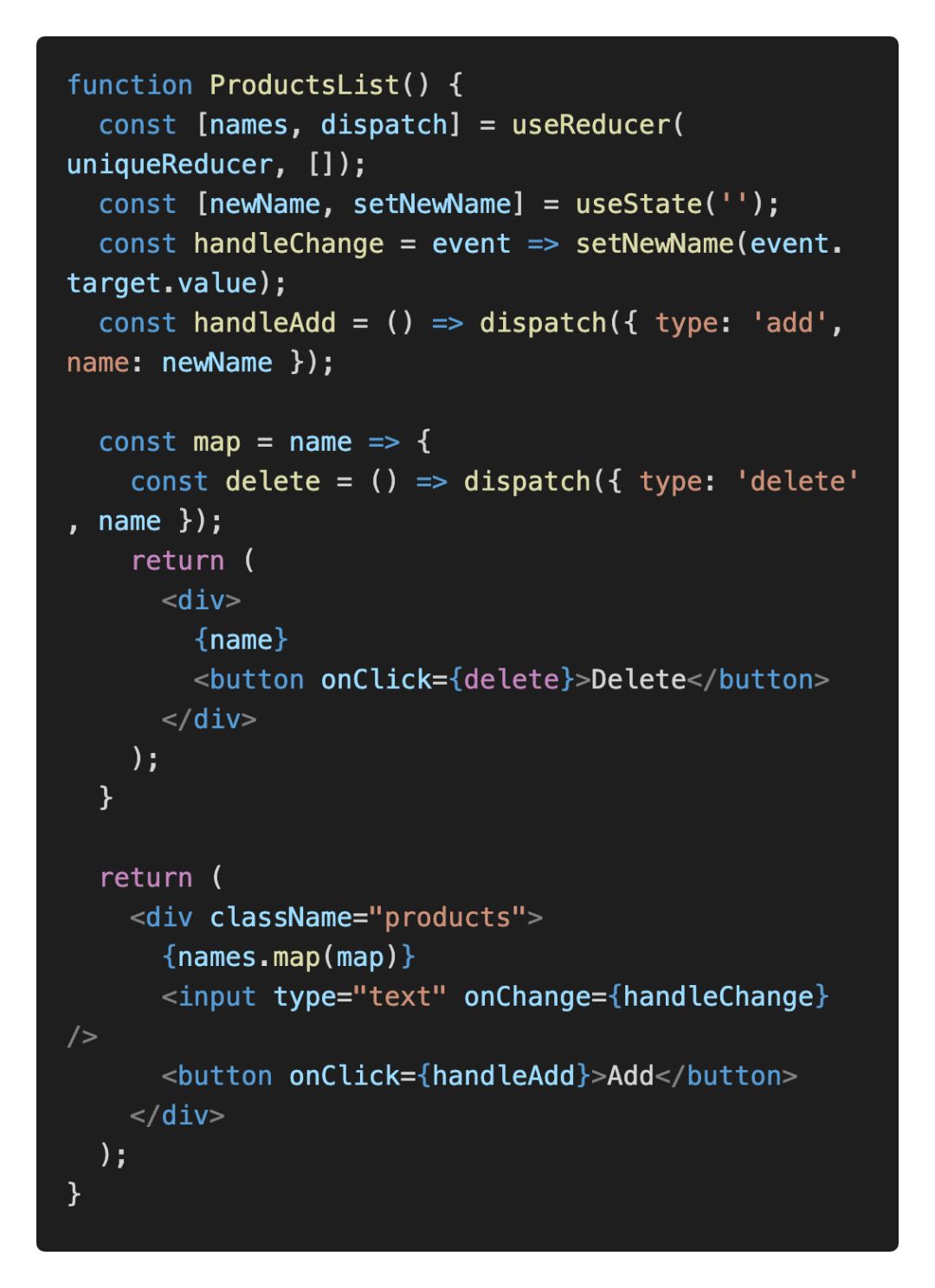const [names, dispatch] = useReducer(uniqueReducer,[])启用了uniqueReducer。names是保存产品名称的状态变量,dispatch是要使用操作对象调用的函数。