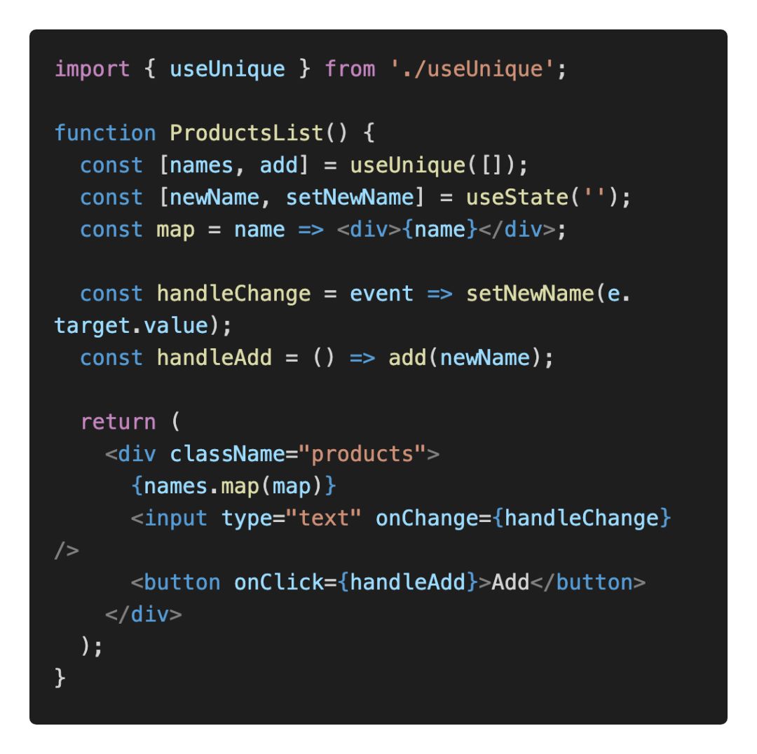 const [names, addName] = useUnique([])是启用自定义Hook的原因。组件不再与复杂的状态管理混杂在一起。