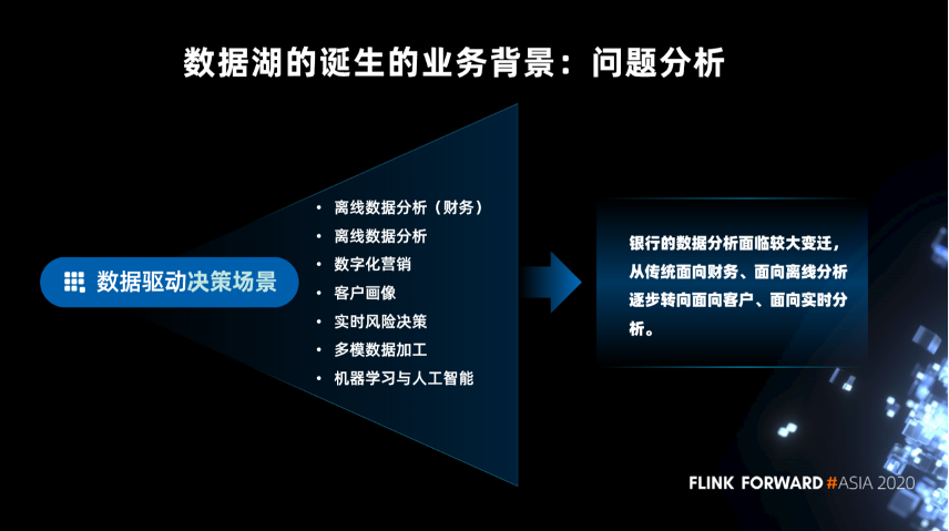 如此多的技术,加上数据驱动决策的场景,决定了当前银行的数据分析面临着一个巨大的变迁,从传统的面向财务的、面向离线的数据分析,逐步转向面向客户的、面向实时的数据分析。