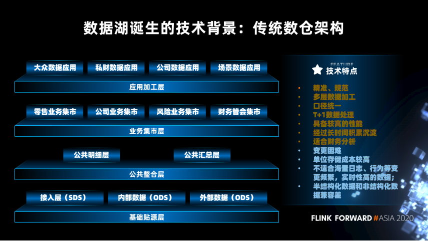 下图展示的是传统的数仓架构。从下往上,依次是基础贴源层、公共数据的整合层、业务集市层和应用加工层。不同的层每天通过批的方式执行大量的运算,来得到业务想要的结果。银行很长时间内非常依赖传统的数仓体系,因为它非常好的解决了财务分析的问题。其特点也比较明显: