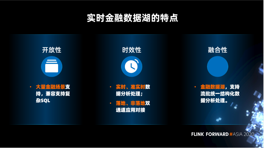 • 第一,开放性。数据湖兼容支持复杂 SQL,支持大量的金融场景。