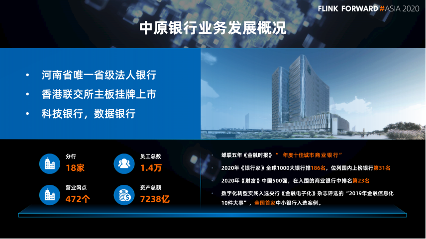 首先简单介绍一下中原银行,它位于河南省郑州市,是河南省唯一的省级法人银行,是河南省最大的城市商业银行。2017 年 7 月 19 日在香港成功上市。中原银行在成立之初就将科技利行和科技兴行作为我行的战略,我行立志要成为一个科技银行和数据银行。我们一直在从事技术,也崇尚技术,希望用技术的手段来解决现在的问题。