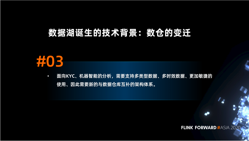 实时金融数据湖建设的第三个观点是,面向 KYC、机器智能的分析,需要支持多类型数据、多时效数据、更加敏捷的使用,因此需要新的与数据仓库互补的架构体系。