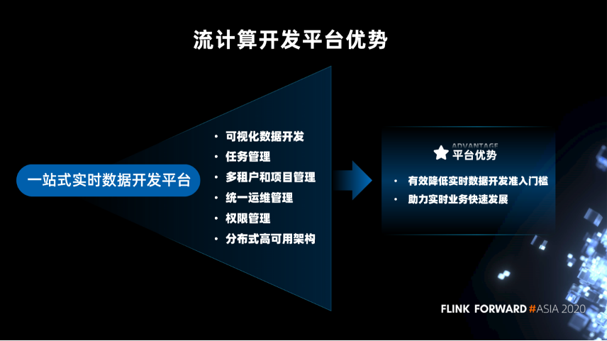 流计算开发平台的优势在于可以有效降低实时数据开发准入门槛,助力实时业务快速发展。通过流计算开发平台,提供一个一站式的实时数据开发平台,包括可视化的数据开发,任务管理,实现多租户和多项目的管理,统一运维管理、权限管理,可以在这个平台上完成实时数据任务的开发。流计算开发平台是基于 Flink SQL 来做的,Flink SQL 本身是一种生产力。