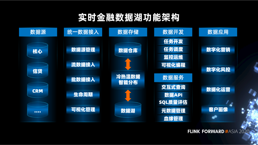 首先来看一下实时金融数据湖的功能架构。在功能上,包括数据源、统一的数据接入、数据存储、数据开发、数据服务和数据应用。