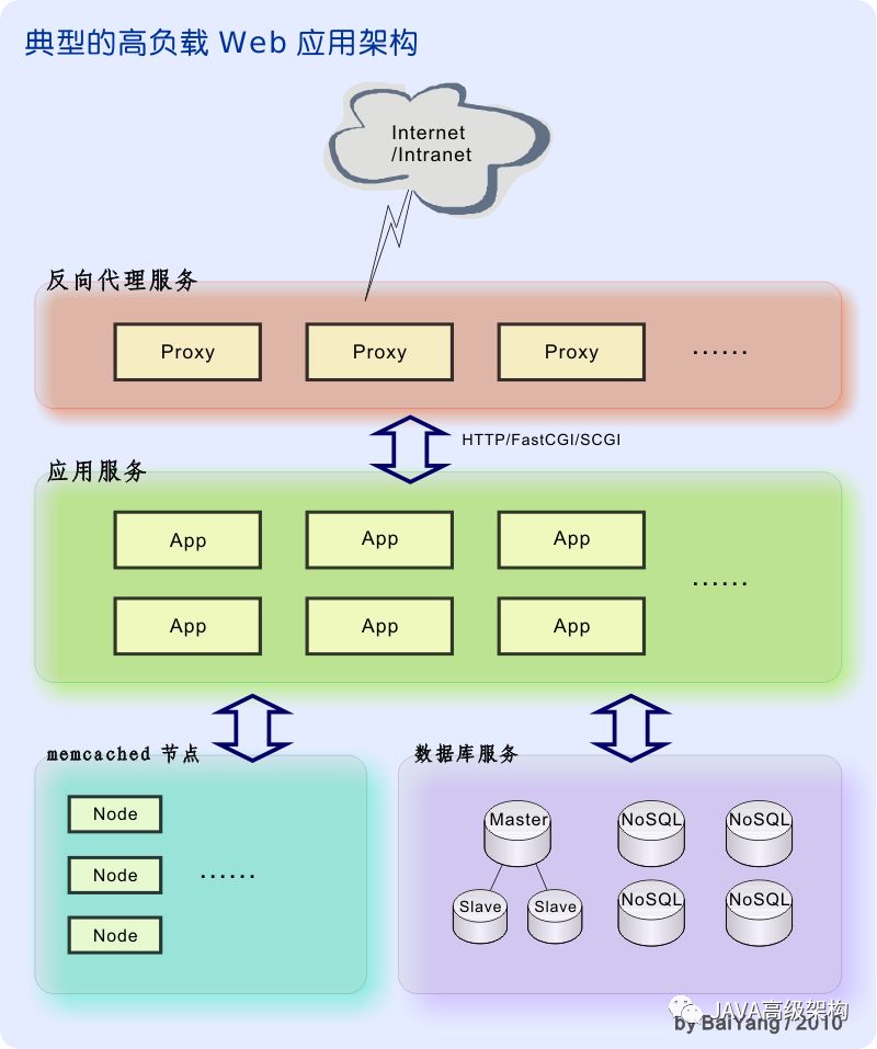 上图展示了一个典型的,三层架构的高性能 Web 应用。这种成熟的架构多年以来已被广泛部署于包括 Google、Yahoo、Facebook、Twitter、Wikipedia 在内的诸多大型 Web 应用中。 |