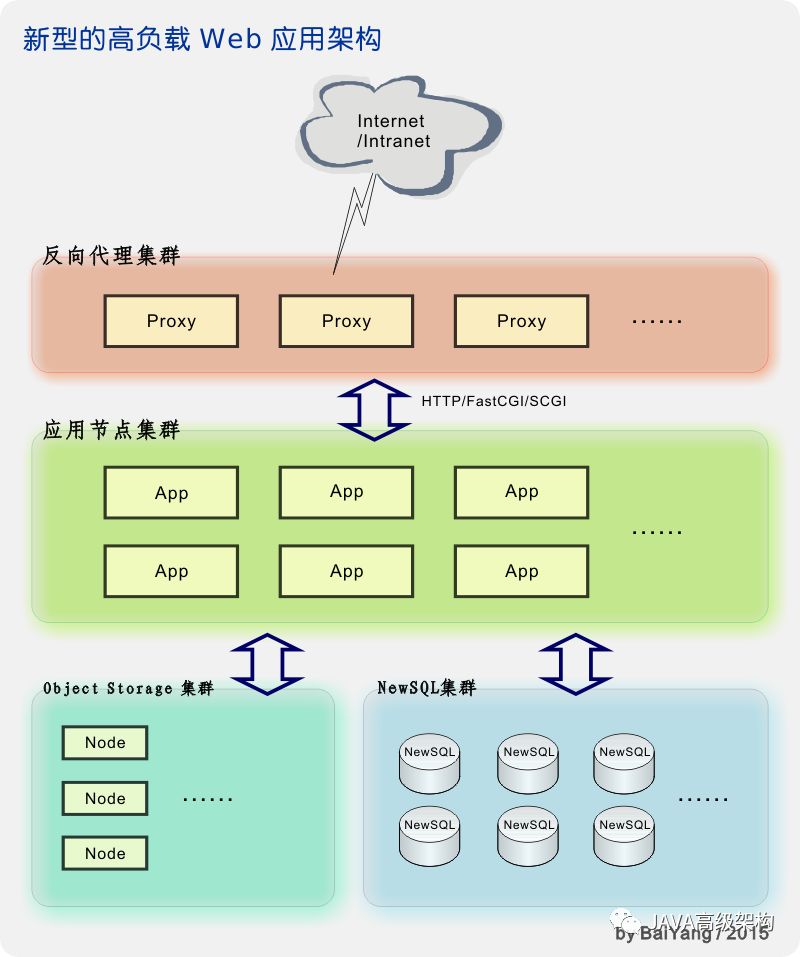 如上图所示,在 NewSQL 具备了良好的横向扩展能力后,架构中不再迫切需要分布式缓存和 NoSQL 产品来弥补这方面的短板,这使得设计和开发工作再次回归到了最初的简洁和清晰。而对象存储(Object Storage)服务则提供了对音频、视频、图片、文件包等海量非结构化BLOB数据的存储和访问支持。 这样简洁、清晰、朴素的架构使一切看起来仿佛回归到了多年以前,对象存储服务就像 FAT、NTFS、Ext3 等磁盘文件系统,NewSQL 服务则好像当年 MySQL、SQL Server 等 "单机版" 数据库。但一切却又已不同,业务逻辑、数据库和文件存储均已演进成为支持横向扩展的高可用集群,在性能、容量、可用性、可靠性、可伸缩性等方面有了巨大的飞跃:人类总是以螺旋上升的方式不断进步——在每一次看似回归的变迁中,实包含了本质的升华。 随着 GlusterFS、Ceph、Lustre 等可 mount 且支持 Native File API 的分布式文件系统越来越成熟和完善,也有望于大部分场合下逐渐替换现有的对象存储服务。至此 Web App 架构的演进才能算是完成了一次重生——这还算不上是涅槃,当我们能够在真正意义上实现出高效、高可用的多虚一(Single System Image)系统时,涅槃才真正降临。那时的我们编写分布式应用与如今编写一个单机版的多线程应用将不会有任何区别——进程天然就是分布式、高可用的! |