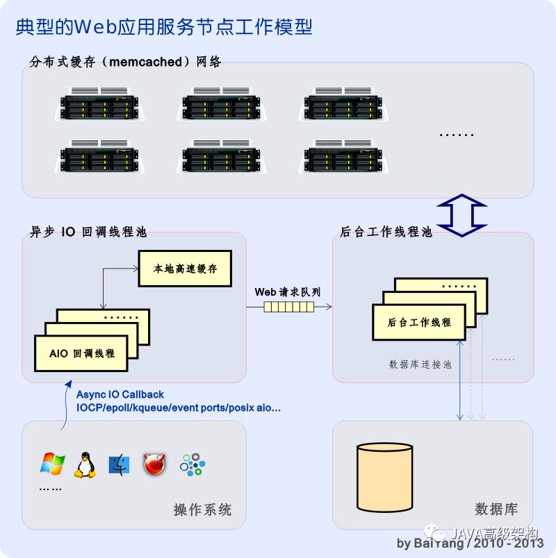 上图给出了一个典型的高并发、高性能应用层节点工作模型。每个 Web 应用节点(在图 5中由标有"App"字样的方框表示)通常都会工作在自己的服务器(物理服务器或VPS)之上,多个应用节点可以有效地并行工作,以方便地实现横向扩展。 在上图所示的例子中,Web 应用节点由 IO 回调线程池、Web 请求队列以及后台工作线程池等三个重要部分组成,其伺服流程如下: