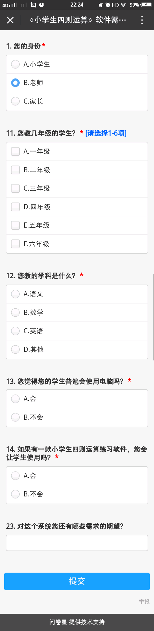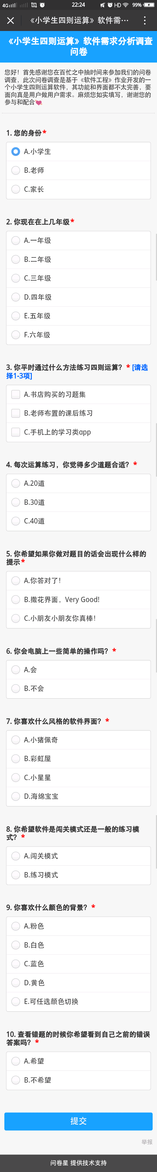 我们通过前两次作业整理了一些问题,用“问卷星”做了一份线上问卷调查,为了更精确的区分不同真实用户对软件的需求,我们把问卷调查分成了三个模块:小学生、老师和家长,通过对不同角色的用户需求调查来完善软件的功能。