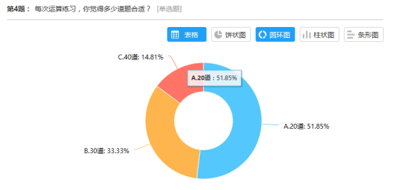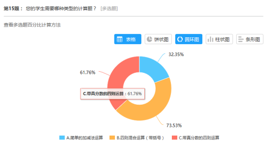 a.问卷显示,有百分之八十以上的老师愿意尝试把四则运算软件给自己的学生使用,对计算题的类型需求最多的是加减乘除混合运算。其他的简单加减法和真分数的练习也占据一部分比重。每天的练习时间在1~2次为宜,题目数量在20~30道左右。