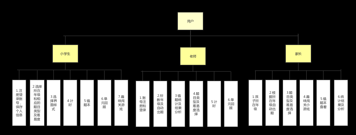 该系统主要的使用群体,需要趣味闯关游戏的吸引力、需要自主选择年级、运算类型和题目难度的权利,需要错题本查看自己的错题和回顾复习。 |