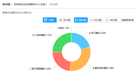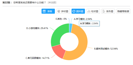 c.在对软件的其他功能需求的调查中,更多的老师偏向于增加小游戏模块和趣味测试模块等比较能吸引小学生的功能模块,同时也有一部分老师需要单元回顾模块。