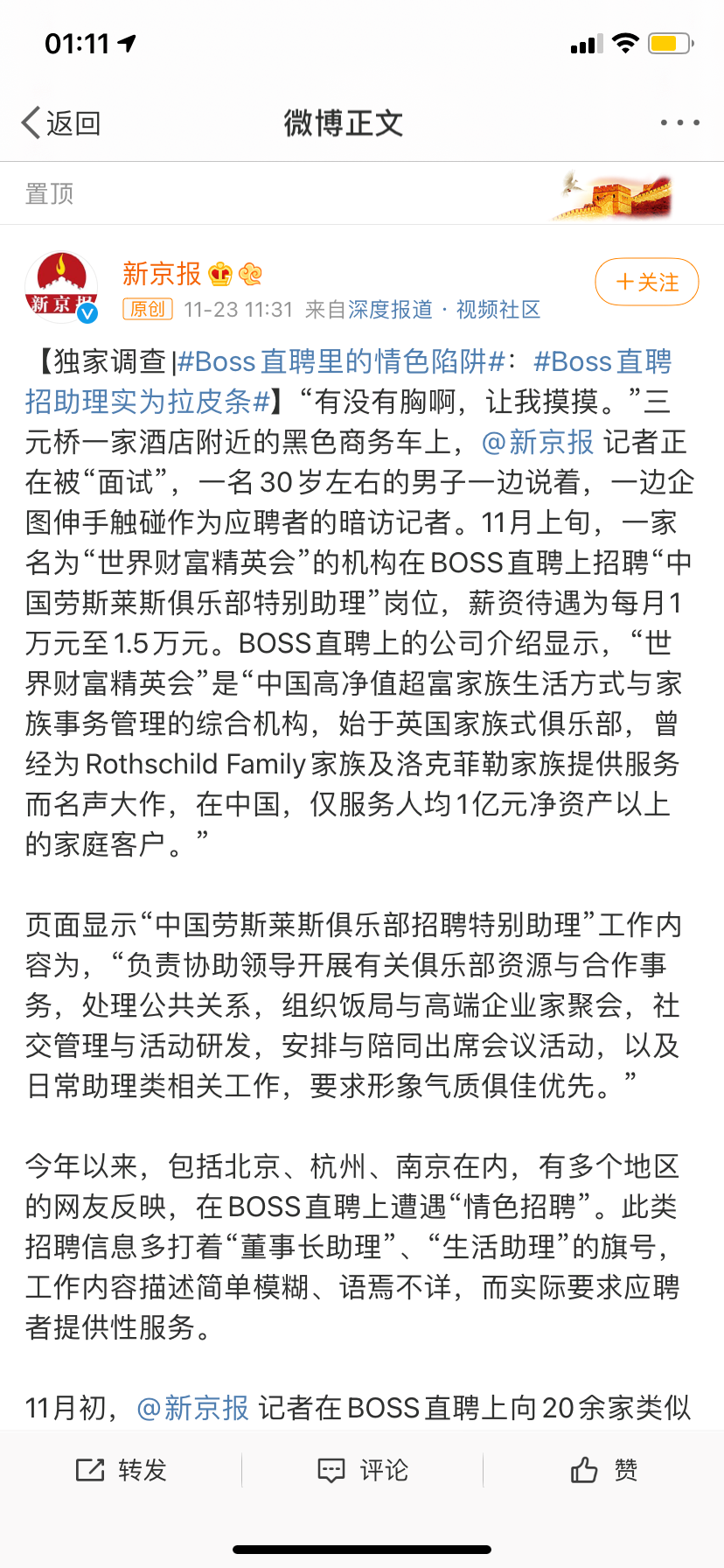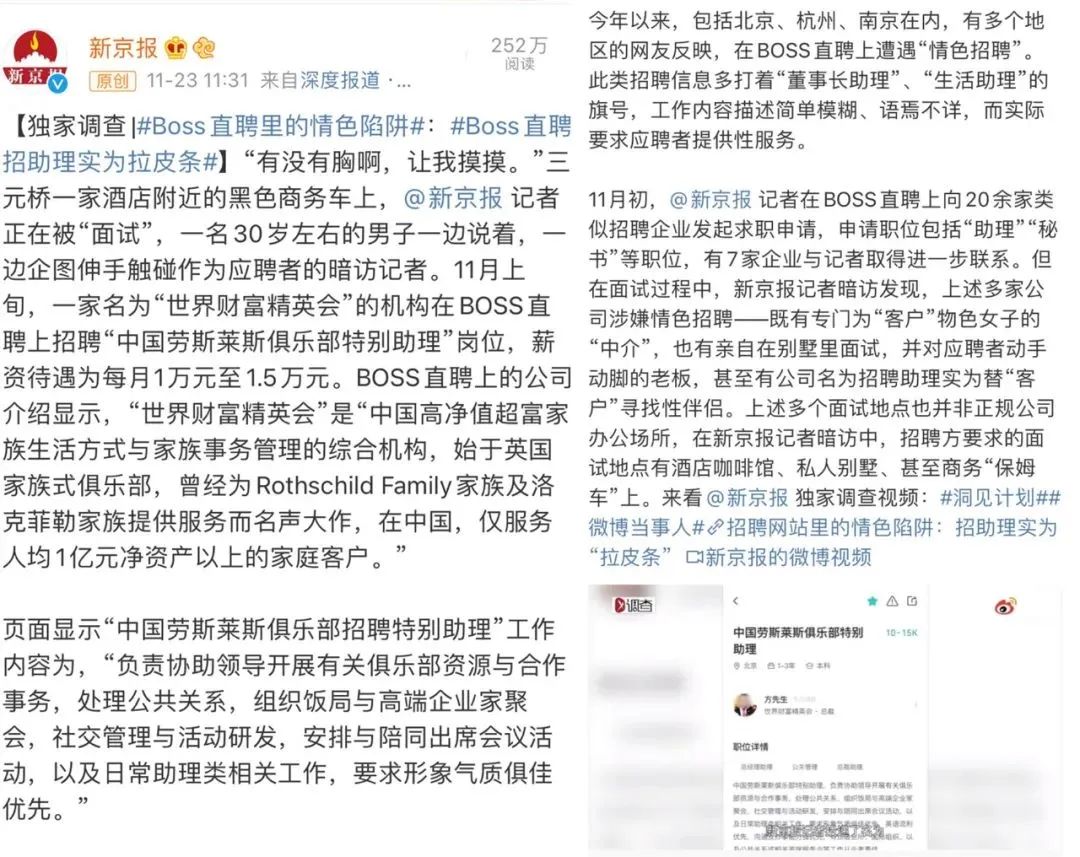 事情是这样...11月23日 据 @新京报 报道,在 BOSS 直聘上发现很多职位:“XXX助理”、“生活助理” 直接搞黄色假招聘(情色招聘)
