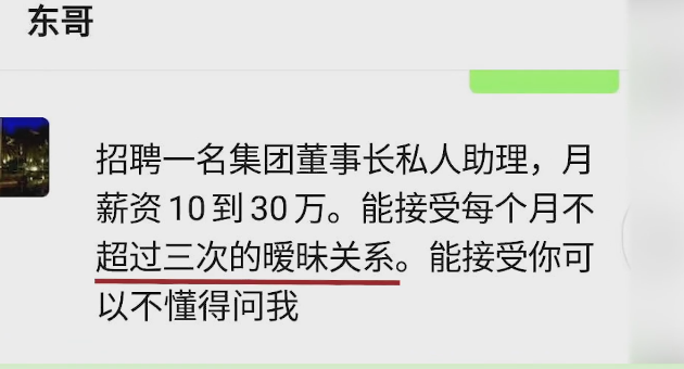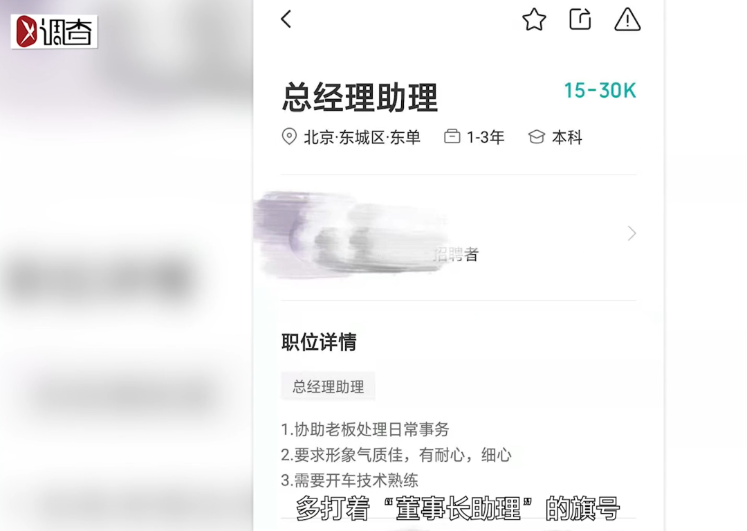 今年以来,包括北京、杭州、南京在内,有多个地区的网友反映,在BOSS直聘上遭遇“情色招聘”。此类招聘信息多打着“董事长助理”、“生活助理”的旗号,工作内容描述简单模糊、语焉不详,而实际要求应聘者提供性服务