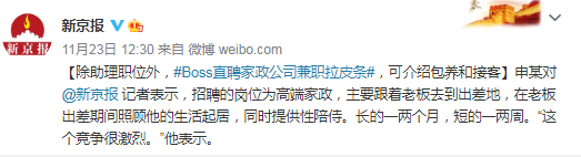 除了类似该机构这种招聘特别助理、生活助理、董事长助理外,新京报表示在平台上还有家政公司兼职拉皮条,一般号称为高端家政,跟着老板出差,提供特殊服务,“竞争很激烈”。