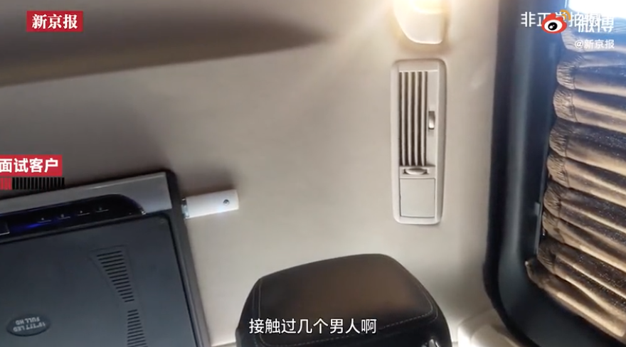 在暗访这家公司的过程中,记者几经辗转、最终在指定保姆车中见到了“面试官”——一位 30 岁左右的男子。期间,该男子:询问记者年龄、性经历要求给自己服务期间、不能和其他男性发生关系要求暗访记者做身体检查、确保没有健康问题要求暗访记者“听话”、调整私密部位询问暗访记者“有没有胸”,且要求抚摸