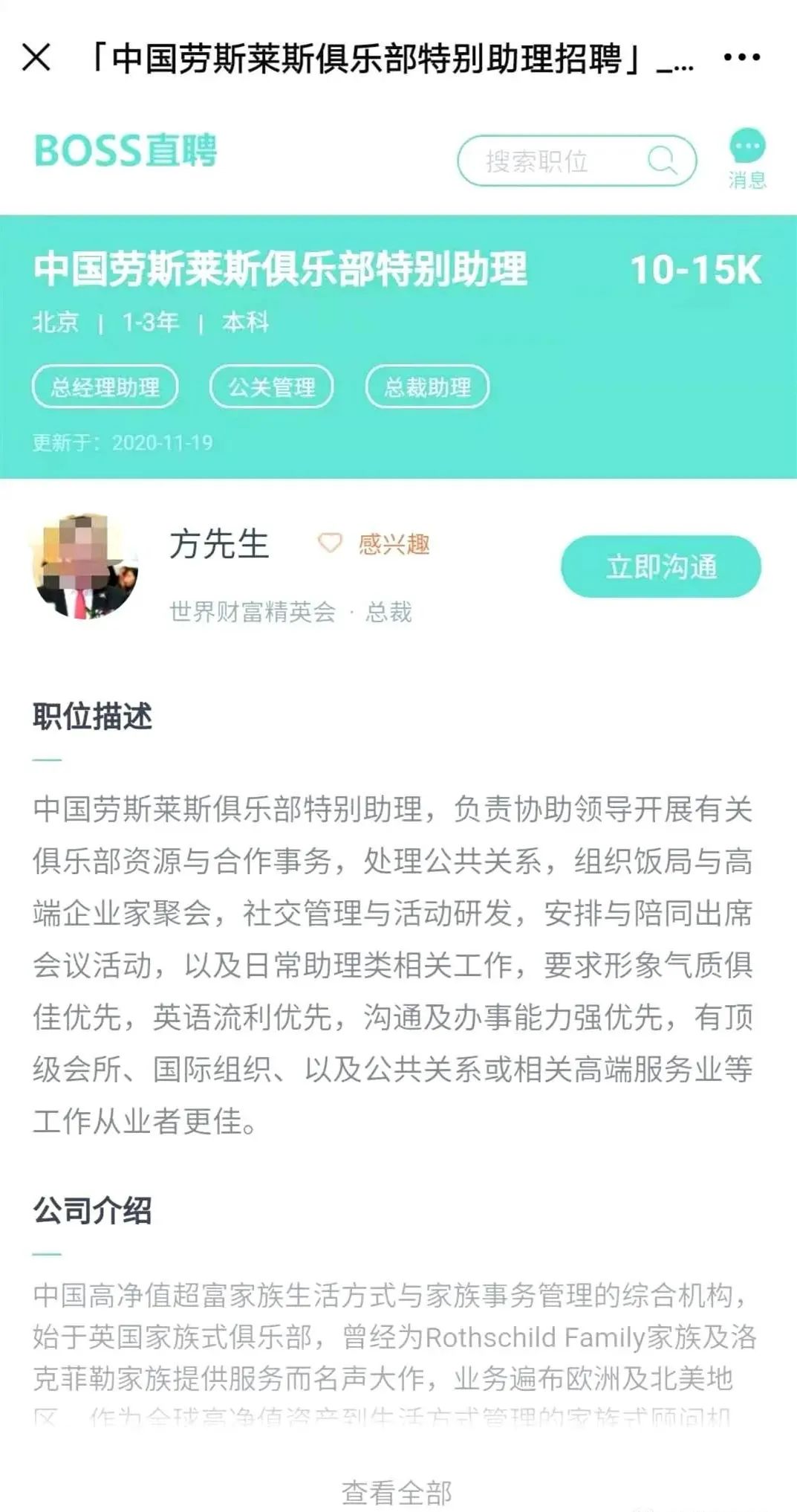 其中,一家名为“世界财富精英会”的机构就在 BOSS 直聘上发布了“中国劳斯莱斯俱乐部特别助理”岗位。