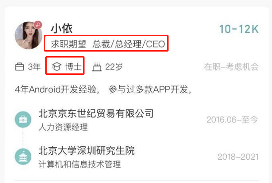 博士学历,18 岁就开始开发 Android、且参加过多款 App 的开发曾在知名公司担任人力资源经理、后进入北大从事计算机技术管理期望职位是薪资水平为 20 万-26 万 的 CEO,但只要求 1 万-1 万 2 的薪资。