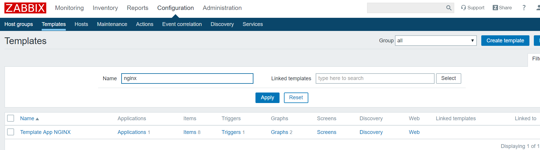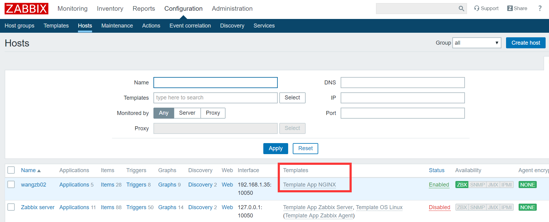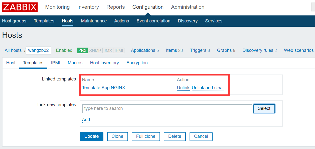 Configuration -> Hosts -> wangzb02 -> Templates -> Select -> Add -> Update