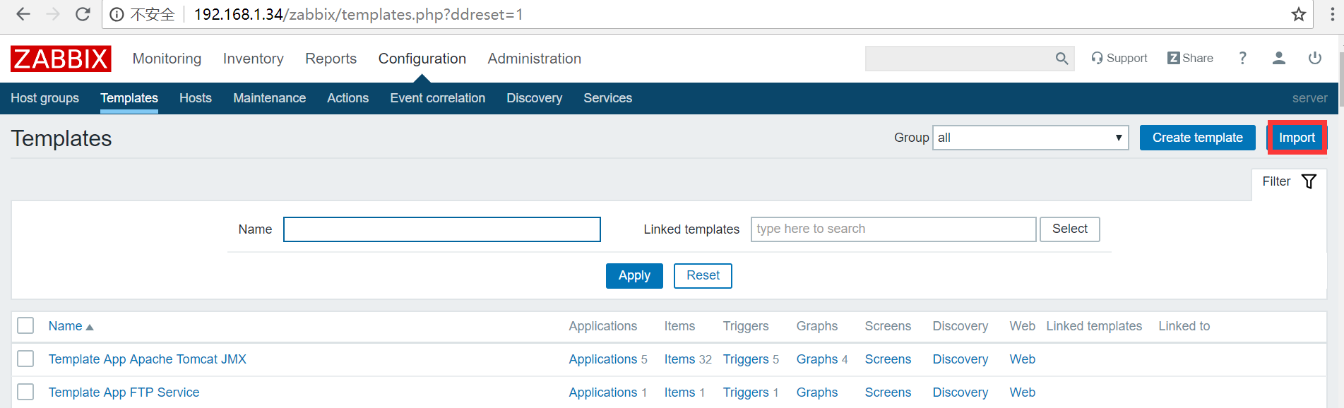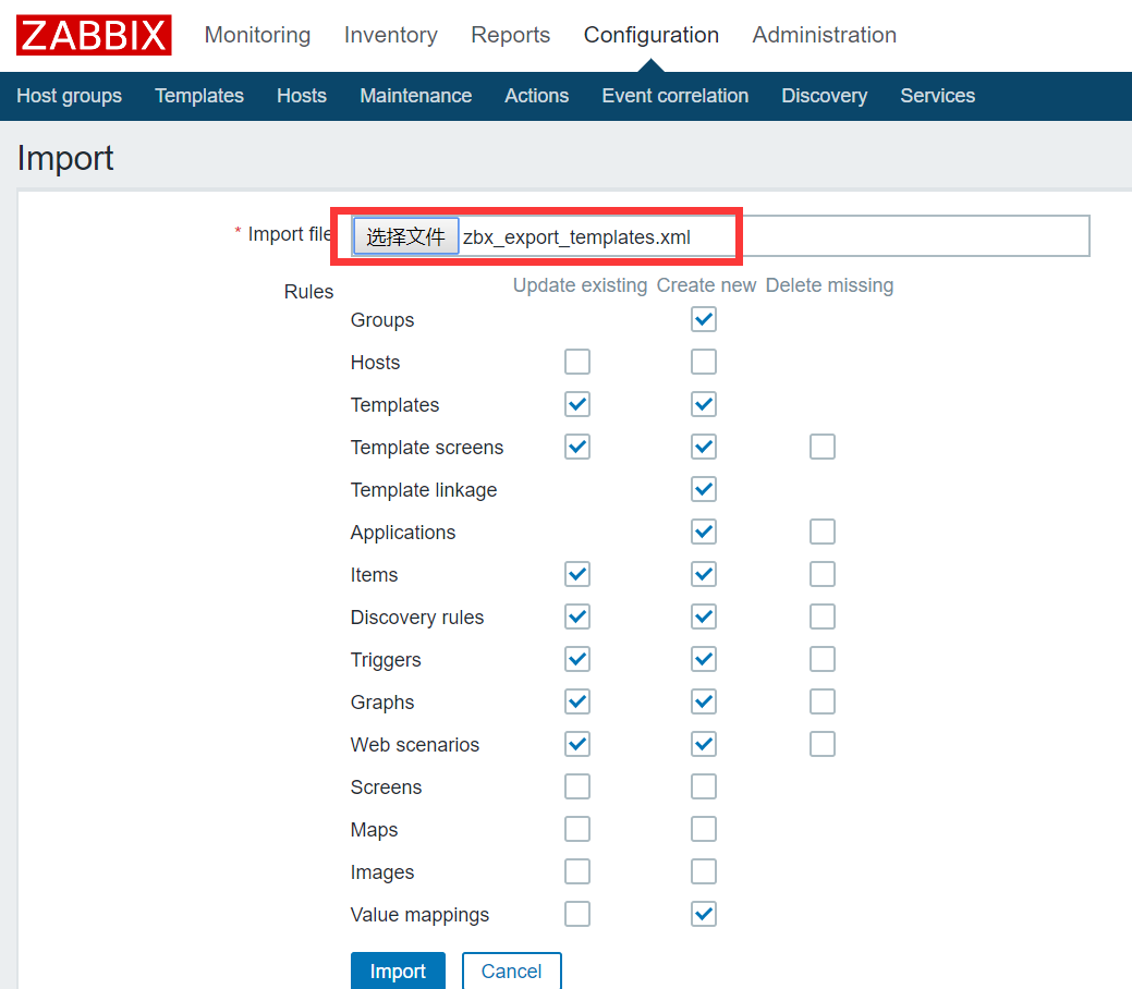 Configuration -> Templates -> 右上角Import