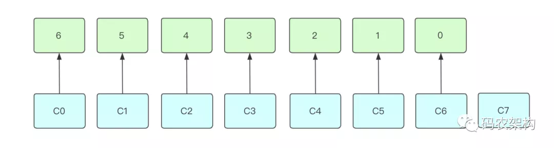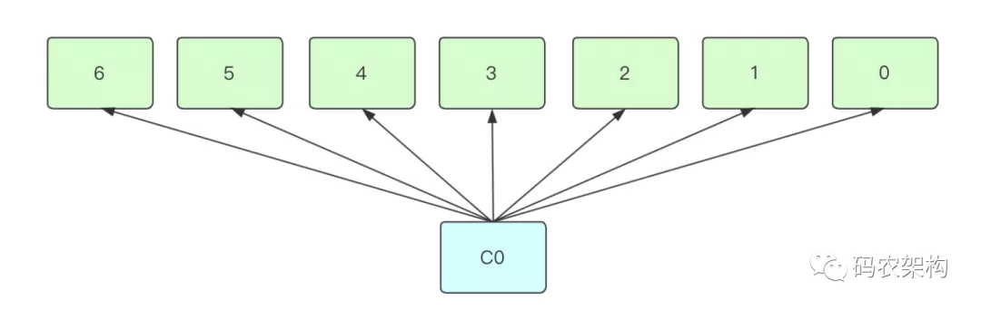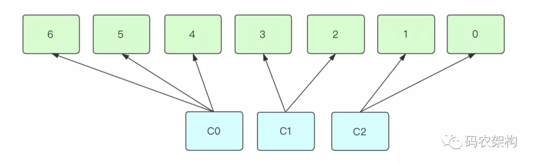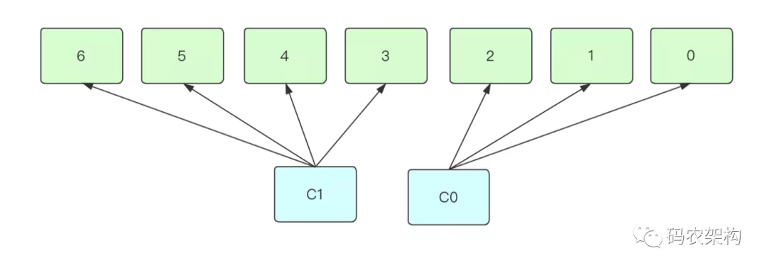 我们再来看一下消费组内的消费者个数变化时所对应的分区分配的演变。假设目前某消费组内只有一个消费者C0,订阅了一个主题,这个主题包含7个分区:P0、P1、P2、P3、P4、P5、P6。也就是说,这个消费者C0订阅了7个分区,具体分配情形参考上图。