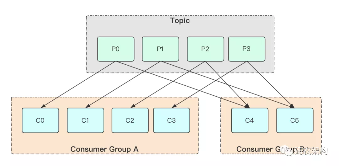如上图所示,某个主题中共有4个分区(Partition):P0、P1、P2、P3。有两个消费组A和B都订阅了这个主题,消费组A中有4个消费者(C0、C1、C2和C3),消费组B中有2个消费者(C4和C5)。按照 Kafka 默认的规则,最后的分配结果是消费组A中的每一个消费者分配到1个分区,消费组B中的每一个消费者分配到2个分区,两个消费组之间互不影响。每个消费者只能消费所分配到的分区中的消息。换言之,每一个分区只能被一个消费组中的一个消费者所消费。